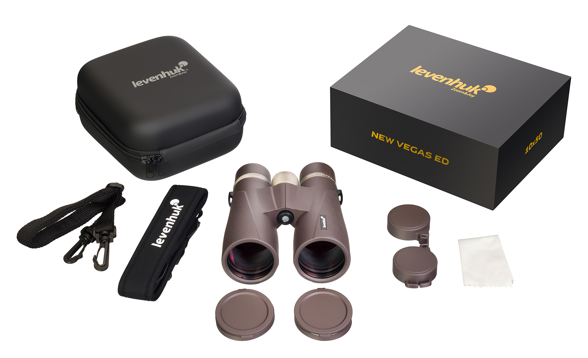 Одна из особенностей Levenhuk New Vegas ED 10x50 – оптическая конструкция, основанная на компактных roof-призмах, выполненных из стекла BaK-4 и отлично собирающих свет. Остальные ее элементы изготовлены из низкодисперсионного ED-стекла, которое ценится любителями и профессионалами за отсутствие хроматических искажений. Дополнительной реалистичности и «живости» изображению придает особая конструкция окуляров, состоящая из пяти элементов в трех группах. Линзы бинокля не подвержены выпадению конденсата при скачках внешней температуры, поскольку внутри прибор заполнен азотом – инертным газом, который не только контролирует последствия воздействия влаги, но и останавливает течение коррозийных и окислительных процессов в корпусе.