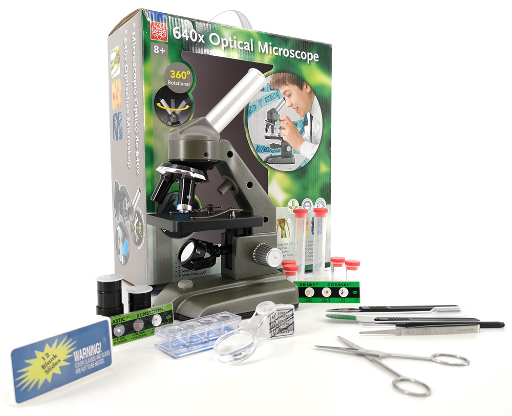 Игрушечный микроскоп со светодиодной подсветкой EDU-TOYS 40–640x придется по душе юному любителю науки. С его помощью можно проводить научные опыты и изучать микробиологические образцы. Прибор представляет собой монокулярную модель с двумя съемными окулярами. В оптическую систему также входит револьверное устройство с тремя встроенными объективами. Микроскоп дает увеличение в диапазоне 40–640х. Модель комплектуется набором для проведения научных опытов.
