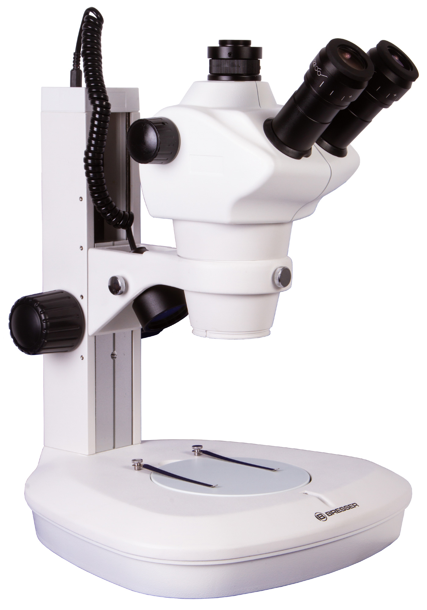 Микроскоп снабжен тринокулярной насадкой. Визуальный узел – классический бинокуляр, для наблюдений используются широкоугольные окуляры с 10-кратным увеличением и возможностью диоптрийной коррекции. Отдельная вертикальная трубка предназначена для установки цифровой камеры (нет в комплекте). Поворотный объектив обеспечивает плавную смену увеличения, общий диапазон кратности микроскопа составляет от 8 до 50 крат.