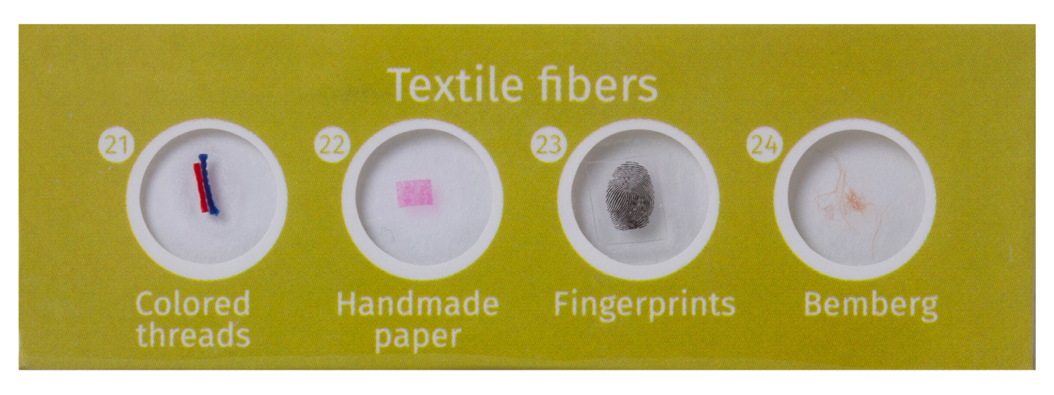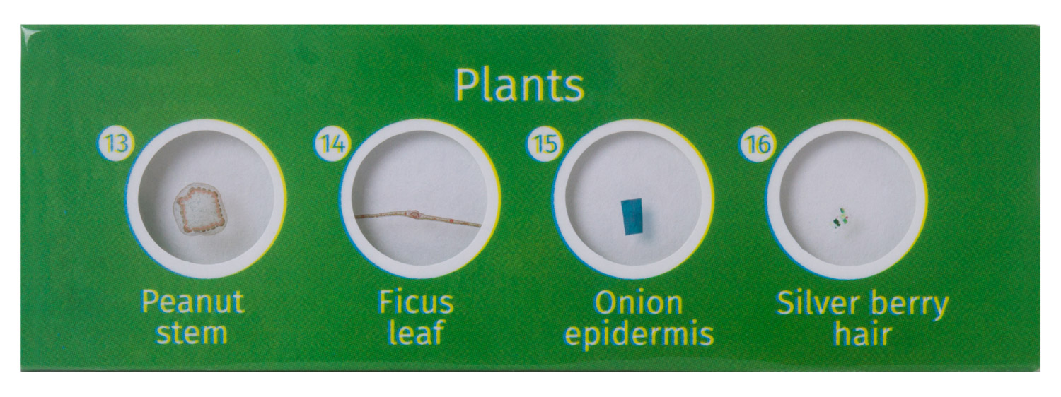 Набор микропрепаратов подойдет к микроскопу с нижней подсветкой, предназначенному для исследований в проходящем свете. На трех слайдах размещены 12 препаратов. Слайды оклеены цветной бумагой с круглыми окошками, в каждом – отдельный препарат. Все образцы подписаны. Набор упакован в яркую цветную коробку из плотного картона.