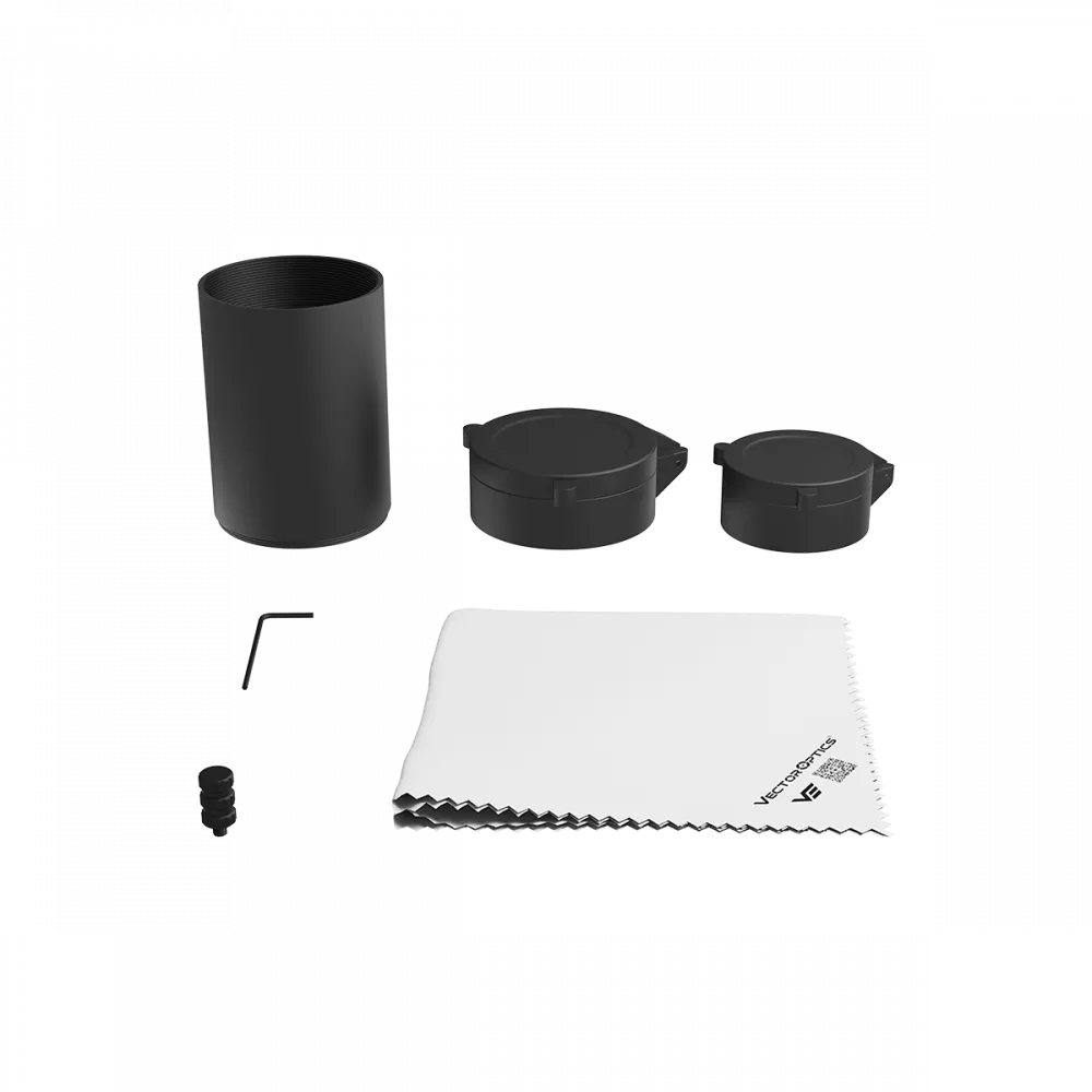 Прицел; Солнцезащитная бленда; Откидные защитные крышки для линз; Салфетка для очистки; Рычаг для регулировки увеличения