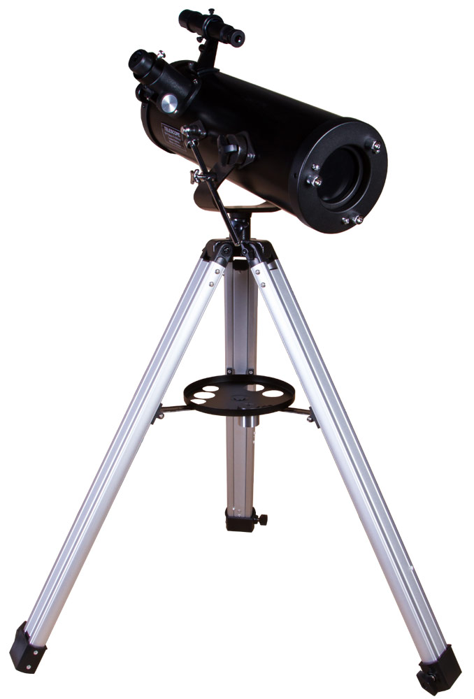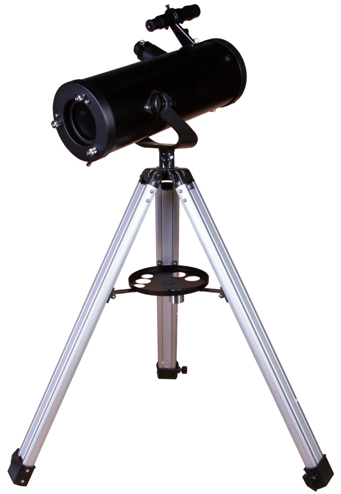 Оптическая труба установлена на классическую азимутальную монтировку. Ею легко управлять, на освоение требуется всего несколько минут. Монтировка, в свою очередь, устанавливается на алюминиевую треногу. Она устойчивая, надежная и регулируется по высоте. При необходимости на треногу можно установить лоток для аксессуаров, чтобы разместить на нем все необходимое для наблюдений. В комплект поставки включено два таких аксессуара – короткофокусный и длиннофокусный окуляры.