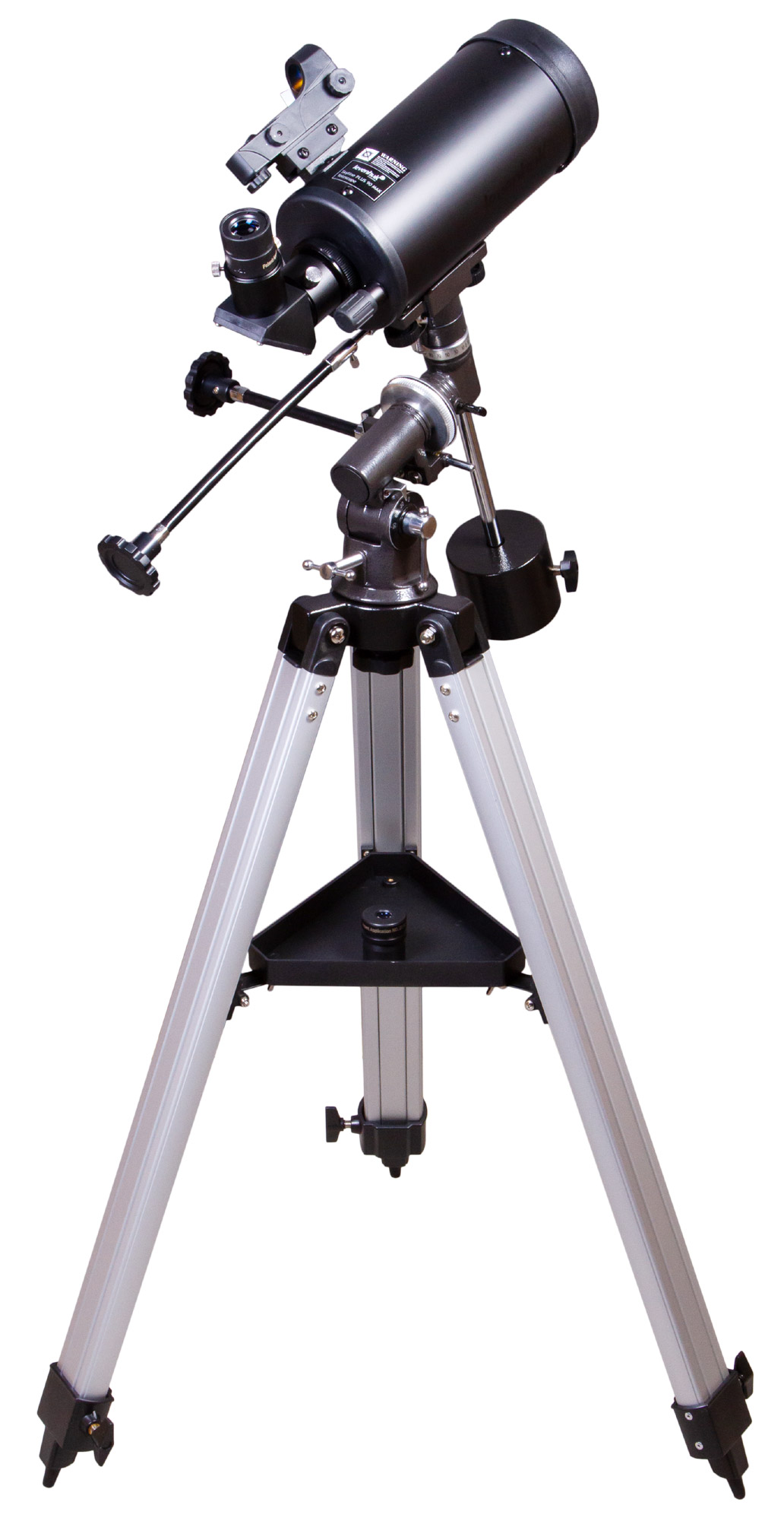 Экваториальная монтировка управляется при помощи ручек тонких движений. Следить за движением небесных тел удобно и легко. Монтировка крепится к алюминиевой треноге. На нее устанавливается лоток для аксессуаров. Высоту ножек треноги можно регулировать.