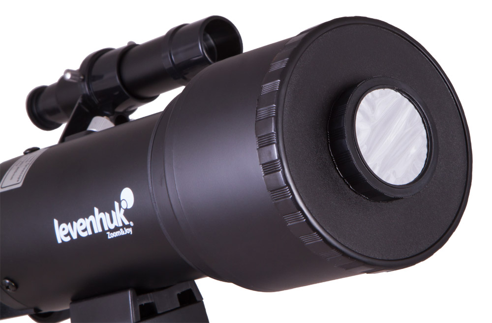 В компактный рефрактор можно наблюдать и Солнце – для этого телескоп снабжен фирменным солнечным фильтром (в комплекте). С его помощью в ясную погоду вы сможете рассмотреть солнечные пятна. Будьте особенно внимательны при наблюдении за солнечной активностью и всегда проверяйте, надежно ли закреплен солнечный фильтр на трубе телескопа. Фильтр должен быть плотно надет на оптическую трубу и полностью перекрывать объектив. При наблюдении Солнца оптический искатель лучше закрыть крышкой или даже снять его, чтобы случайно не навредить зрению.
