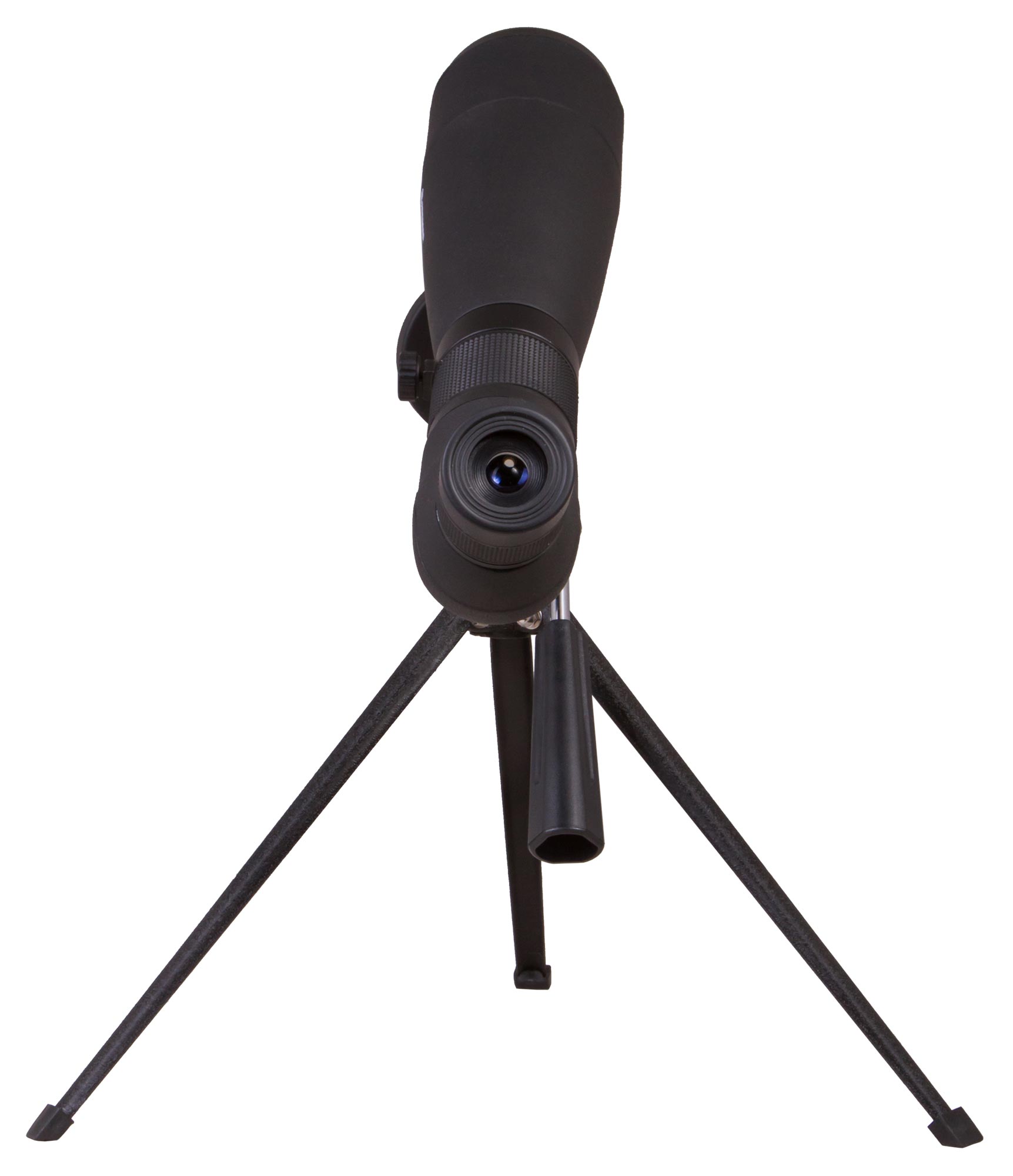 Пластиковый корпус защищен слоем резины, которая оберегает зрительную трубу от случайных ударов и пыли. В комплект поставки включен настольный штатив.
